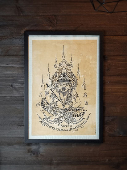 Essa arte foi pintada manualmente com tinta nanquim e finalizada com borra de café e calor, para conferir o aspecto envelhecido. Ela é uma representação Sak Yant entitulada como POH KAE RUESI SAMING PRAI KHEM SAK, que pode ser traduzido como Poh Kae Ruesi segurando uma agulha de tatuagem. Ele é utilizado nas tatuagens por que é considerado forte e poderoso, conhecido por seu grande poder de proteger contra perigos, magia negra e acidentes. Também é utilizado para a cura, tornando a pessoa invulnerável, transformando coisas ruins em coisas boas.